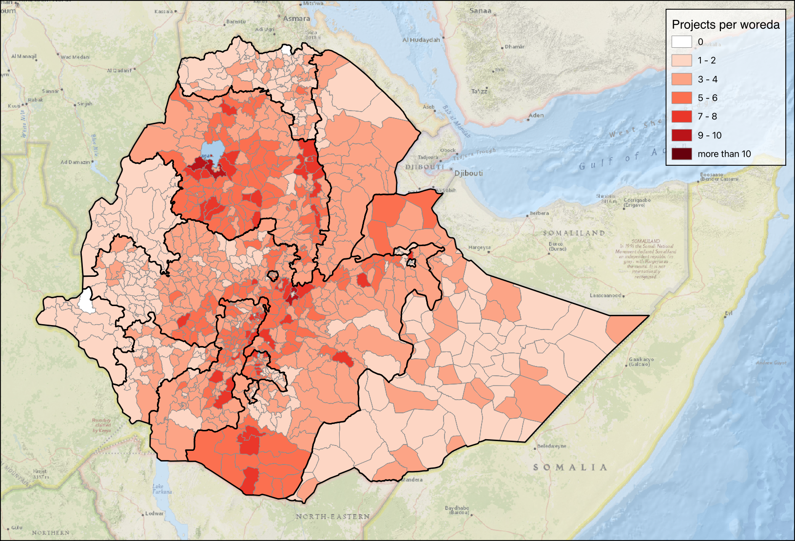 The map on this page shows the projects financed by the Embassy of the Netherlands in Addis Ababa. The number of projects per woreda is shown with an orange shading, and the coloured dots represent the theme of each project. A summary of projects is displayed in the table below the map.